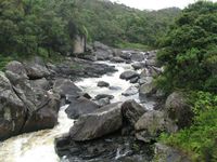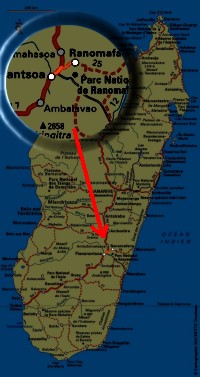 Après une bonne nuit de sommeil, un réveil dans une ambiance plutôt humide et un bon petit dej, on commence la journée par la quête d'un vêtement imperméable pour préparer la rando du jour (mon coupe-vent est resté à Tana). Ensuite, direction le parc national de Ranomafana qui servira de décor pour une bonne randonnée. Il s'agit en fait d'une forêt primaire située à une soixantaine de kilomètres de Fianarantsoa. Vous savez comment on dit forêt primaire en anglais ? ... Rainforest. En ben ca porte drolement drôlement bien son nom en cette journée. L'ambiance est vraiment tropicale et très très humide. Il fait lourd. Je loue les service d'un guide à l'entrée du parc qui me fera découvrir le parc. La balade doit durer environ 4 heures. C'est là que je fais connaissance avec les parasites de cette forêt : les sangsues ! La forêt en est infestée et le climat très humide en cette journée est très favorable à ces mauvaises rencontres. En plus, il est très difficile de s'en débarasser. J'en retirerais en tout, une bonne quinzaine durant la journée.