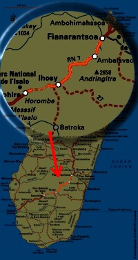 Journée de transition aujourd'hui. Départ de Fianar pour rejoindre la ville de Ranohira au bord du parc national de l'Isalo. Le changement de décor est cette fois remarquable. Fini les rizières et autres plantations. Elles laissent la place à des prairies qui s'étendent à l'infini. La route est parfois rectiligne jusqu'à l'horizon. Après une première petite halte à Ambalavao pour visiter une papetrie artisanale et une seconde à Ihosy pour manger un bout, nous entrons dans une région qui tient plus du far west que de l'Afrique.
