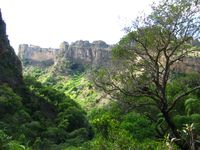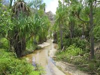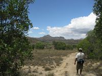 Journée un peu plus sportive prévue aujourd'hui avec la visite du parc national de l'Isalo. Il s'agit d'un gros bloc de grès creusé par quelques cours d'eau. Le climat y est très aride mais près des cours d'eau, la végétation devient luxuriante ce qui offre de véritables petits coins de paradis. Voici une photo qui montre le décor habituel du parc. Sur les suivantes, on voit bien les canyons.