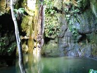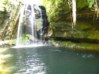 C'est là que se trouve la fameuse cascade. Il s'agit, comme la plupart des sites que nous verrons d'un petit bassin dans lequel se jette une cascade, ici, haute d'une vingtaine de mètres. L'eau est transparente. Mais pas facile de prendre des photos à cause du contraste très important entre le ciel et le fond du canyon.