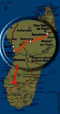Après quelques heures de route, nous arrivons à Sakaraha, c'est LA ville des chercheurs de saphir. Le sous-sol de Madagascar regorge par endroit de pierres précieuses et semi-précieuses. Il n'y a qu'à se promener dans les marchés de Tananarive pour décourir le nombre incalculable de marchands de pierres. Sakaraha fait un peu penser à une ville du far west à la grande époque de la ruée vers l'or. C'est tout aussi dangereux à cause d'une véritable mafia qui règne ici et il ne fait pas forcément bon s'y attarder. Nous nous arrêtons à l'écart de la ville mais nous la traversons d'un trait.