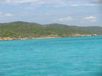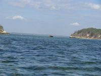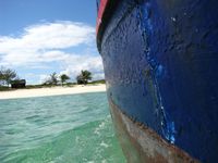 La traversée secoue un peu le petit bateau. Ca devient sympa. Nous apercevons au loin le changement de couleur de la mer qui se raproche de plus en plus. Nous passerons environ 1h sur le bateau jusqu'à une ile minuscule et déserte avec une plage merveilleuse sur laquelle ont été construit quelques abris en bambou pour permettre aux touristes de se poser un peu.