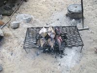 Nous débarquons temporairement avant de repartir en bateau un peu plus loin pour faire un peu de masque-tuba pendant que l'équipage se lance à la chasse sous-marine au harpon pour le repas de midi. Au bout d'une bonne demi-heure, nous nous redirigeons vers notre petite plage de reve. Entretemps, 2 autres bateaux ont jeté l'ancre devant la plage. Elle est bien assez grande pour tout le monde. Un petit feu est allumé sur la plage pour faire cuire les poissons tout frais pendant que nous prenons l'apéro. Le repas est excellent. Nous passerons encore quelques heures sur cette plage entre bronzette pour les uns et baignades pour les autres, avant de reprendre le bateau pour le trajet de retour.
