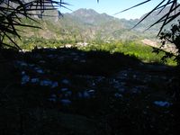 J'y suis rejoint, pour le petit déjeuner, par Cécile, venue de St Paul pour m'accompagner durant une partie de la rando du jour qui me mènera au trou de fer. Durée prévue : 6h de marche. Dénivelé positif : 820m. Après un bon petit dej, nous nous mettons en route. Après quelques minutes de grimpette, nous avons déjà sous les yeux, une très belle vue sur Hell Bourg, malheureusement toujours plongé dans la pénombre.