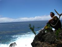 Puis je retourne à l'anse des cascades. L'endroit m'a bien plu la veille et j'y ai vu un sentier qui part longer la côte en surplombant les falaises qui dominent une mer plutot agitée. Le sentier est plus long que je ne l'imaginais mais est vraiment magnifique. Je passe un bon moment à regarder les vagues s'écraser sur les rochers. Quelle puissance ! On a aussi une vue sympa sur le piton de la Fournaise et ses coulées de lave.