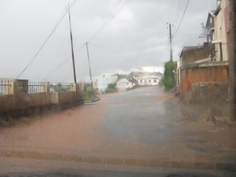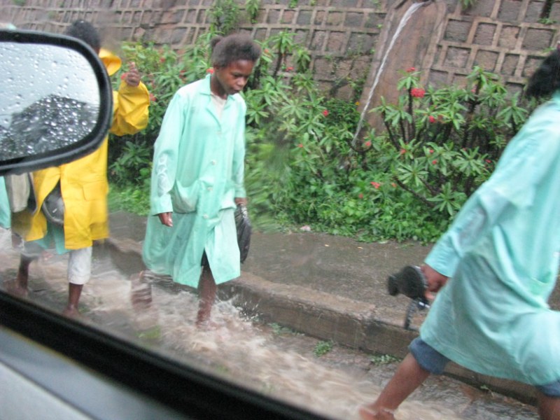 L'après-midi, au retour d'une petite balade, on se retrouve pris sous une pluie tropicale (saison oblige). On restera coincé une heure dans la voiture dans une rue. Sûrement une 4L qui a dû boire la tasse. En attendant, les enfants rentrent de l'école, chaussures à la main et pataugeant dans l'eau. Mais le sourire est toujours de mise.